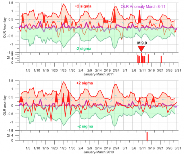 Figure 3. Time series of OLR atmospheric variability observed within a 200 km radius of the Tohoku earthquake (top to bottom). A.) Day-time anomalous OLR from January 1- March 31, 2011 observed from NOAA-15 AVHRR (06.30LT) B.) 2001, seismicity (M>6.0) within 200km radius of the M 9.0 epicenter. C.) Day-time anomalous OLR from January 1- March 31, 2010 observed from NOAA-15 AVHRR (06.30LT) D.) seismicity (M>6.0) within 200km radius of the M 9.0 epicenter for 2010.