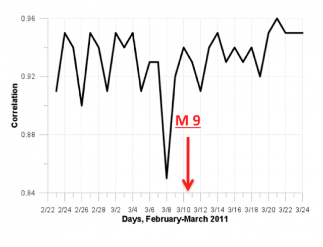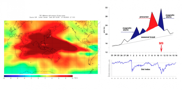 The report goes on to say “From March 3-11 a large increase in electron concentration was recorded at all four Japanese ground based ionosondes, which return to normal after the main earthquake. We found a positive correlation between the atmospheric and ionospheric anomalies and the Tohoku earthquake. View the the entire report here.