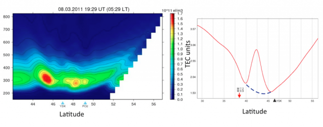 Figure 6. Ionospheric tomography reconstruction over Japan using COSMOS (Russia) satellites and receivers installed at Sakhalin Island (Russia). See Fig.1. (A) Tomography map of March 8, 2011, 05.29 LT; and (B) Ionospheric reconstruction over Japan for March 2011. Blue dash line the TEC reference line (without earthquake influence). Red arrow – location of M9.0 earthquake, and black triangles, location of the ground receiver.