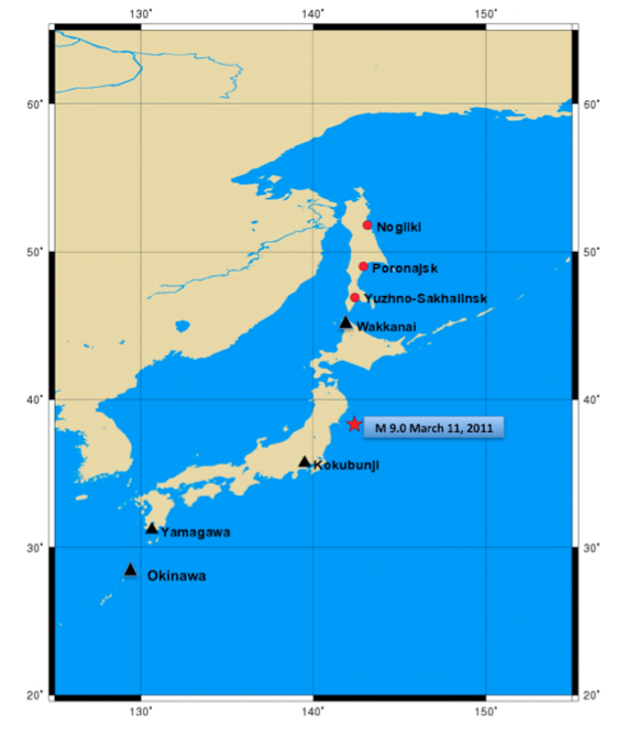 Figure 1. Reference map of Japan with the location of the M9.0 Tohoku Earthquake, March 11, 2011 (with red star). With red circles showing the location of the tomographic data receivers and with black triangles the location of vertical ionosonde stations in Japan.