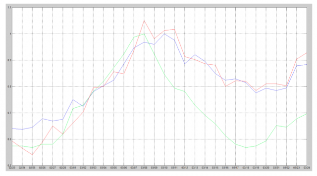 Figure 5 Normalized variations of solar F10.7 radio flux (green), GEC index (blue) and modified GEC (30° around the epicenter of Tohoku earthquake) red.