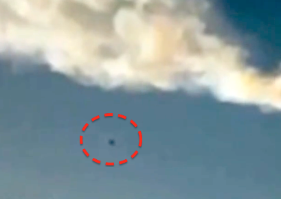 Waring says, “Look carefully and you will notice a dark object that hovers below the smoky trail of the meteor that exploded over Russia this week. The dark object doesn’t move, but appears to be watching the fallout of the explosion and its effect on the city and people below. Could it be that this alien craft actually caused the meteor to explode before it hit the ground…saving thousands of lives? It seems like aliens do intervene when we really need them”